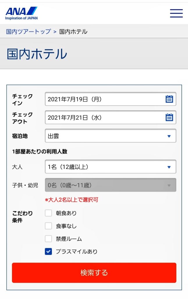 そして以下の画像↓の様に国内ホテルを検索するよ。