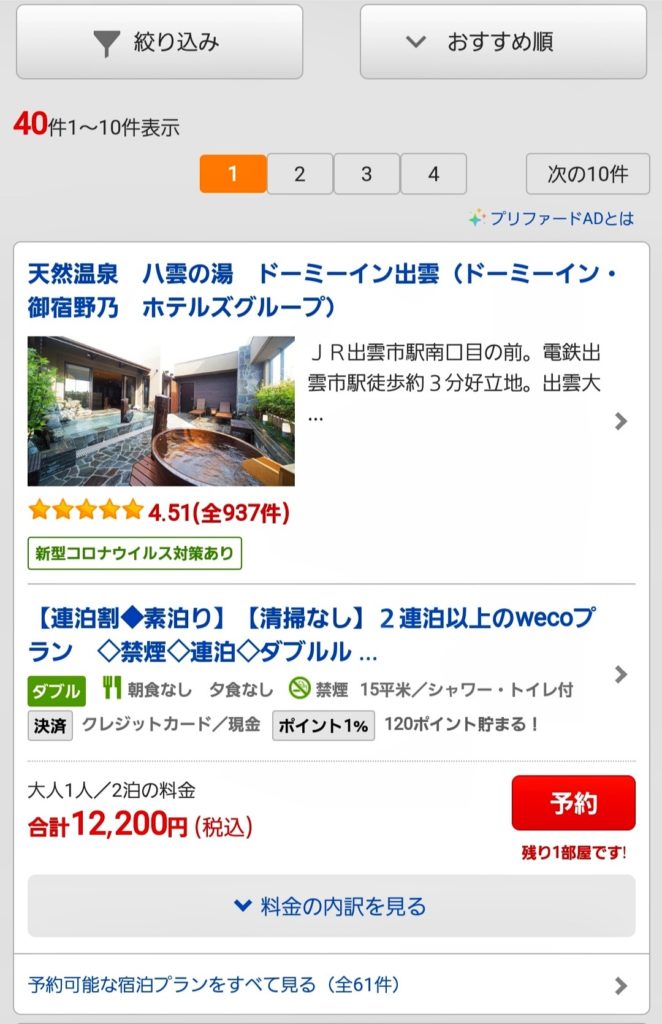 っで、同じ日程で楽天トラベル↓を検索するとね、